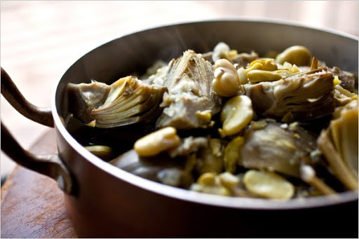 Advance preparation: You can prepare this a day or two ahead of serving, and reheat on top of the stove. Leftovers will be good for four to five days. The color of the favas will fade, but the flavors won’t.