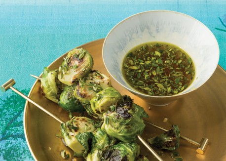 Roasted Brussels Sprouts Skewers with Lemon-Thyme Dipping Sauce
