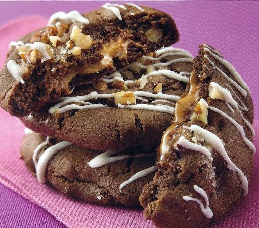 Chocolate cookies with a chewy caramel Rolo inside and as if that wasn't enough - a drizzling of melted white chocolate tops it all off!