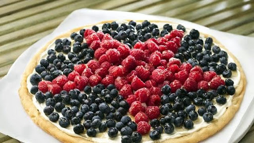 Heat oven to 350°F. Spray 12-inch pizza pan with cooking spray. Cut cookie dough into ¼-inch slices; place in pan. With floured fingers, press evenly over bottom to form crust. Bake 15 to 20 minutes or until deep golden brown. Cool completely, about 25 minutes. In medium bowl, beat cream cheese, powdered sugar and lemon peel until fluffy. Spread over baked crust. Arrange raspberries in large star shape in center. Arrange blueberries around raspberries. Drizzle or brush with melted jelly. Refrigerate until set, about 30 minutes. Store in refrigerator.
