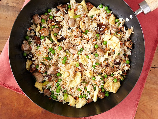 Wipe out the pan with a paper towel and heat the remaining peanut oil over high heat. Add the scallions and carrots and stir-fry for 1 1/2 minutes. Add the mushrooms, garlic, chile, and ginger, stir-fry for 1 minute more. Add the soy sauce, sesame oil and rice and stir-fry for 2 to 3 minutes. Add the meat, peas, and reserved egg, cook, stirring until heated through, about 2 to 3 minutes. Serve immediately.