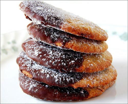 Dip halves of cookies into chocolate and allow to dry on wire racks. When dry, sift confectioners' sugar over the tops of both sides.