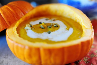 Reheat if you need to, or just go ahead and serve in a hollowed-out pumpkin of whatever size you’d like.