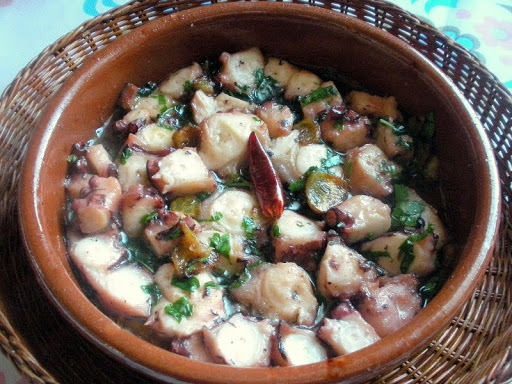Ponemos el aceite con la guindilla en la cazuela, doramos en él los ajos. Cuando están dorados añadimos el pulpo, cortado en rodajas con unas tijeras. Dejamos cocinar tres o cuatro minutos, le ponemos la sal y el perejil picado. Cocinamos un minuto más y listo para llevar a la mesa