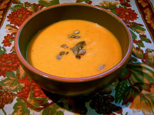 Cool pumpkin mixture slightly; process in batches in a blender or food processor. Transfer to a large saucepan; heat through. Garnish with toasted pumpkin seeds.