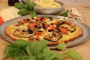 Follow the instructions to prepare your pizza dough. Prepare a cookie sheet or pizza round with non-stick cooking spray then roll out dough. Spread mashed potatoes over the dough and then add the toppings finishing with basil ribbons, a drizzle of olive oil and salt.
