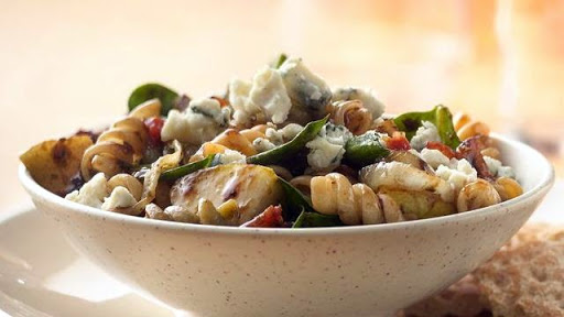 Fill a 3-quart saucepan 2/3 full of water; heat to boiling. Add pasta and gently boil, uncovered, 12 minutes, stirring occasionally; drain. Rinse with cold water to cool; drain well. In a large nonstick skillet, cook bacon and onion, stirring occasionally, until bacon is crisp. Transfer bacon and onion to large bowl with slotted spoon, reserving bacon drippings. Stir seasoning mix from packet, balsamic vinegar, brown sugar, oil and mustard into drippings. In large bowl, toss bacon and onion mixture, spinach, pear and dressing until mixed; stir in cooked pasta. Sprinkle blue cheese over top of salad. Serve warm.