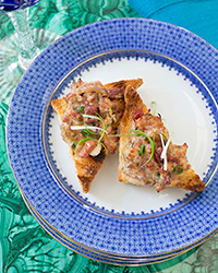 Spread some of the spiced ham mixture on each toast triangle and bake for about 10 minutes, until browned in spots. Garnish the ham-and-cheese toasts with the julienned scallions and serve right away.