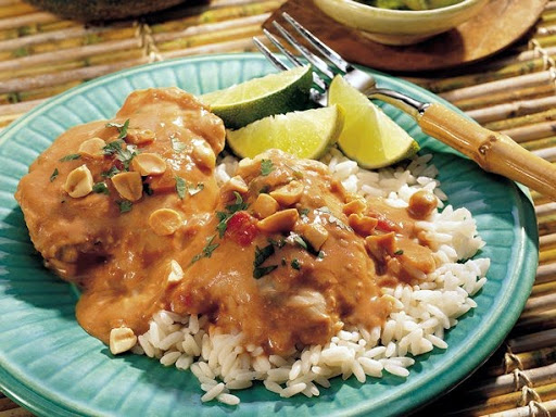3 Remove sauce from slow cooker; skim fat from sauce. Pour sauce over chicken. Sprinkle with peanuts and cilantro.