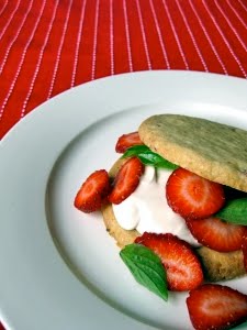 Then pile the fruit and creme on top of the shortbread and sprinkle with basil.