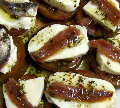 Salamos ligeramente las rodajas de tomate. Cortamos en rodajas del mismo tamaño la mozzarela. Le añadimos por encima un trozo de anchoa en conserva. Finalmente aliñamos con el aceite aromatizado con las hierbas que habremos preparado unas horas o días antes.