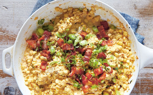 Creamed corn goes to a new level made with fresh corn, a little bacon and some heavy cream. Take the time to puree a little bit to make it nice and creamy.