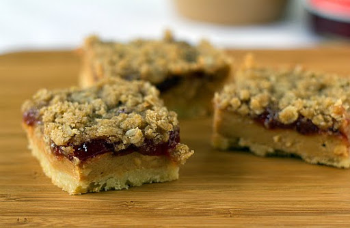 9. Assemble the Bars: Spread the jelly in an even layer over the peanut butter filling. Sprinkle on the crumb topping, covering the jelly.