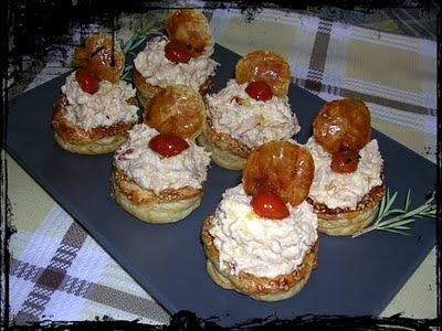 Mientras se hacen, pelamos los huevos cocidos y los rallamos, añadimos el atún escurrido y desmigado, los cherrys escurridos y la mayonesa, lo mezclamos bien y lo tendremos listo en la nevera para cuando los volovanes estén hechos y fríos.