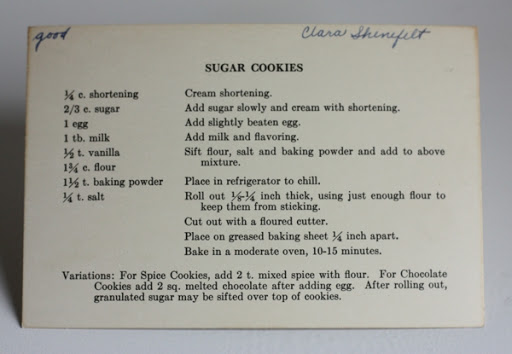 I love classic sugar cookies, and I’m always on the lookout for new recipes to try. For this week’s Halloween neighborhood street party, I wanted to bake a batch of pretty fall leaf cutout cookies. Rather than return to my essential sugar cookie recipe, I thumbed through my collection of vintage recipes to see if Clara had a basic sugar cookie recipe. (Read more about The Clara Project and the circa 1930s recipes that inspired it.)