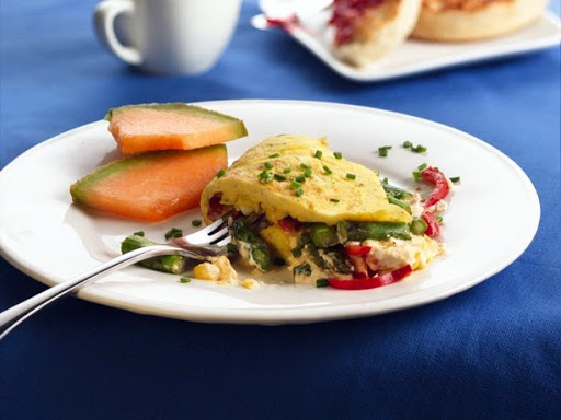 3 Spoon 1/4 cup of the cream cheese in dollops evenly over omelet; top with half of the asparagus and bell pepper. Tilt skillet and slip pancake turner under omelet to loosen. Remove from heat. Fold omelet in half; remove omelet from skillet. Repeat with remaining ingredients. To serve, cut each omelet crosswise in half; sprinkle with chives.