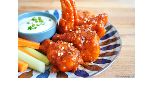7. Place carrot and celery sticks, blue cheese dip and buffalo wings on a serving plate. Garnish blue cheese dip with chopped chives and buffalo wings with a mixture of hot chili flakes, cayenne pepper and paprika. Ready to serve!