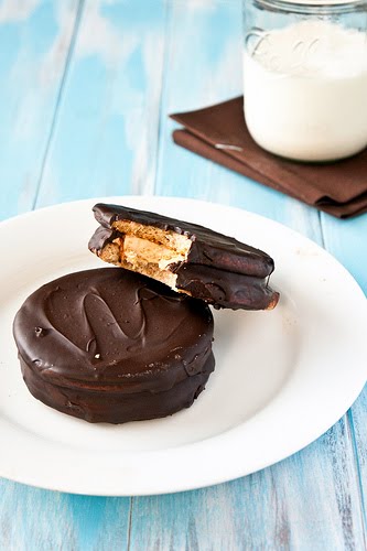 Holding the bottom cookie with your fingertips, dip the cookies in the chocolate and shake to remove excess. Set on a rack above a baking sheet to catch any drips (I didn't coat the very bottom with chocolate).