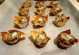 Separate wonton wrappers and place in muffin tin to form a cup. Bake in 350 oven for 6-8 minutes or until crisp and lightly golden. Remove from pan and cool on rack. Repeat with remaining wrappers. If making ahead, store in airtight container at room temperature.