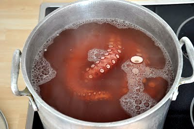 Paso Nº2. Asustamos al Pulpo, esto se hace para evitar que se despegue la piel del Pulpo al cocer.Cuando el agua esté hirviendo sujetamos el pulpo por la cabeza, metemos y sacamos del agua 3 veces, y después dejamos en el agua