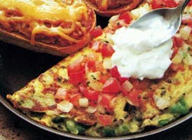 3 Fold portion of omelet just to center. Allow for a portion of the omelet to slide up side of pan. Turn omelet onto warm plate, flipping folded portion of omelet over so it rolls over the bottom. Tuck sides of omelet under if necessary. Top with tomatoes and sour cream; sprinkle with cilantro.