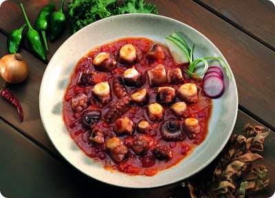 Aparte, derrita la mantequilla y fría la cebolla hasta que esté doradita, añada el jitomate y deje sazonar muy bien, agregue las pasitas, las almendras, las aceitunas, los chipotles, el consomé y los pulpos y, por último, el vino tinto. Si es necesario agregar un poco de fondo de cocción. Se deja hervir unos minutos y se sirve.