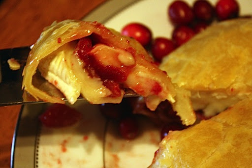 To prepare the cheese, slice the cheese in half so that you have two wheels. Unfold the puff pastry and place one cheese wheel in the center with the cut side facing up. Top with the cranberry and pear mixture, and then place the second piece of cheese on top (cut side down). Gather the pastry up around the cheese, and pinch the edges to seal. Make sure there are no gaps, or the cheese will seep through when it melts! Flip the whole thing over so that the smooth side is on the top.