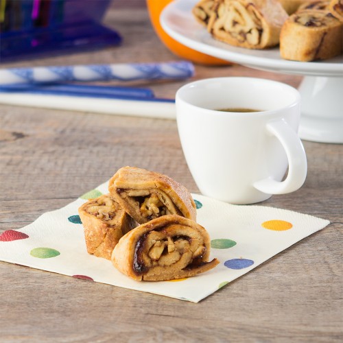 Finish with the seam side down and cover with plastic wrap. Place roll on a board and then repeat the process with other dough half. Place rolls in the freezer for about 20-25 minutes. Cut into 1-inch slices using a serrated knife cutting gently so the dough does not break. Place slices on prepared baking sheet spaced apart slightly. Brush with beaten egg and sprinkle with additional cinnamon sugar. Bake for 15 minutes and turn oven temperature down to 325°F. Bake 20-25 minutes more or until the tops are golden brown. Makes about 34 rugelach.