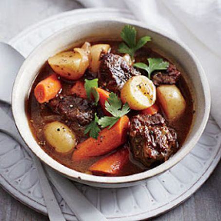 A traditional recipe for hearty beef stew with a base of onions and garlic, deglazed with brown ale, thickened with potatoes, and flavored with Dijon mustard & thyme.