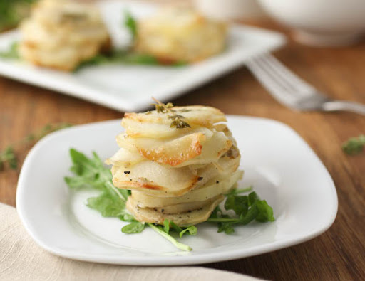 Fill rings completely with pared, raw potatoes sliced very thin and dipped in melted butter, bacon fat or drippings. Season layers of potatoes with salt and pepper. Put pat of butter atop of each.