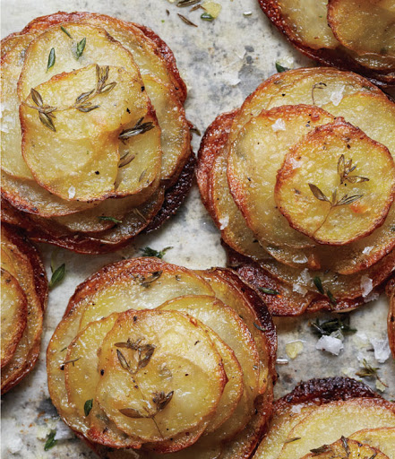 Bake until potatoes can be pierced easily with the tip of a knife, about 35 minutes. Remove foil; invert a rimmed baking sheet over pan. Turn, lightly tapping on counter, releasing potatoes onto sheet. Rearrange any slices that may have fallen out. Using a metal spatula, carefully turn cakes, thyme sprigs facing down. Discard parchment. DO AHEAD Potatoes can be made 1 day ahead. Cover; chill.