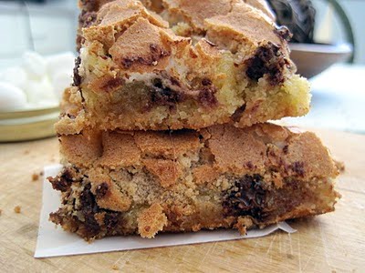 Beat together sugar and butter until creamy. Beat in 1 whole egg and 2 egg yolks (put aside the whites for later). IN a seperate bowl, mix together the flour, salt and baking powder. Add to the butter mixture and mix well. Spread into 9x13" pan. Sprinkle with marshmallows, nuts and chocolate chips.