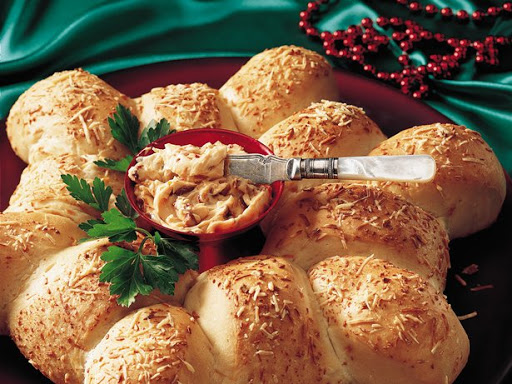 * Fill the center of the wreath with a dish of olive oil garnished with fresh rosemary sprigs or a dish of sun-dried tomato butter. To make the butter, beat 1/4 cup softened butter with 2 tablespoons chopped, drained, oil-packed sun-dried tomatoes.