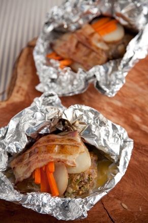 Place each patty onto 2 layers of heavy-duty aluminum foil (enough to cover and close). On each patty, place potato slices, onion slice, and carrots. Slice bacon in half and place both slices on top. Seal aluminum foil tightly and cook on campfire or in a 350 degree oven for approximately 45 minutes.