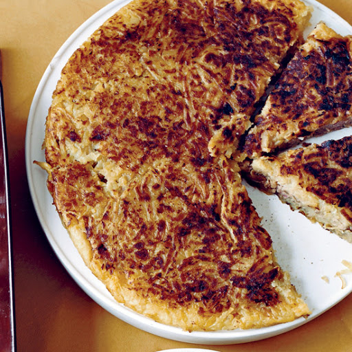 Wipe out the skillet and coat with 1 tablespoon of the olive oil. Press half of the shredded potatoes in the bottom of the skillet and partially up the side. Spread the sausage mixture over the potatoes, leaving a 1-inch border all around. Press the remaining potatoes on top in an even layer, sealing the edges. Cook over moderately high heat until the bottom is golden, 15 minutes.