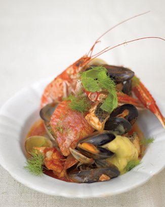 Its worth trying to get hold of saffron for this one its available from most delis and good supermarkets. Its not cheap, but bear in mind you wont need much at all to spice up a dish. Make sure you use a wide pan so all the fish is in contact with the tomatoey broth. If you havent got one, try using a high-sided roasting tray instead, with another tray as a lid. To make the saffron aïoli, smash a clove of garlic, a tiny squeeze of lemon juice, and the saffron (if using) with a small pinch of salt in a pestle and mortar or a flavor Shaker until it turns into a mush. Add a tablespoon of mayonnaise and pound again. Stir in the rest of the mayo. Taste and season with a little more lemon juice, salt and pepper. Give the mussels and clams a good wash in plenty of clean cold water and scrub any dirty ones lightly with a scrubbing brush, pulling off any beardy bits. If there are any that arent tightly closed, give them a sharp tap. If they dont close up, throw them away. Heat a large, wide saucepan or stewing pot and pour in a splash of olive oil. Slice up the rest of the garlic and fry it in the oil until lightly golden. Add the wine and the tomatoes and the basil stalks and bring to the boil. Simmer gently for 10 to 15 minutes, until the liquid has reduced a little. Add all your fish and shellfish in a single layer and season with salt and pepper. Push the fish down into the liquid and put the lid on. Cook gently for about 10 minutes or until all the clams and mussels have opened and the fish filets and langoustines or prawns are cooked through. (Discard any clams or mussels that dont open.) Toast the bread on a hot griddle pan and get out the serving bowls. Put a piece of toast in each bowl and ladle the soup over the top, making sure the fish is divided more or less evenly. Top each bowl with some fennel tops, basil leaves, a drizzle of extra virgin olive oil and a big blob of saffron aïoli. from Cook With Jamie
