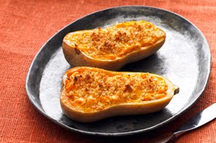 2. Cut squash lengthwise in half; scoop out seeds. Add water to 13x9-inch baking dish; place squash, cut-sides down, in dish. Cover. Bake 40 min. or until squash is tender when pierced with knife. Cool 10 min. Transfer squash to cutting board; drain liquid from dish.