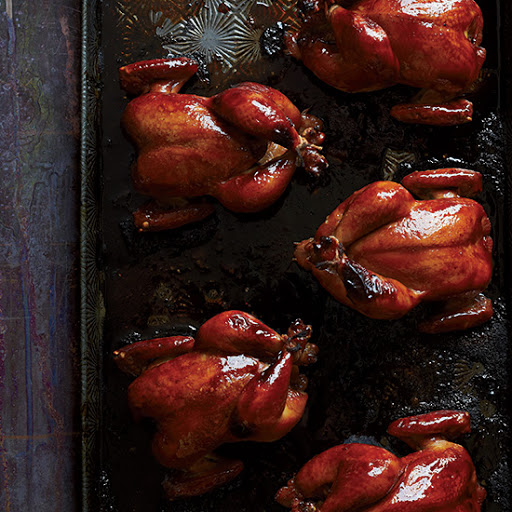 Roast the hens in the upper and lower thirds of the oven for 10 minutes, or until lightly browned. Reduce the oven temperature to 375°. Roast the hens for 50 minutes longer, basting with the reserved marinade every 15 minutes and shifting the pans from front to back and top to bottom halfway through roasting. The hens are done when the cavity juices run clear and an instant-read thermometer inserted in the inner thighs registers 160°. Transfer the hens to a platter and let rest for 10 minutes before serving.