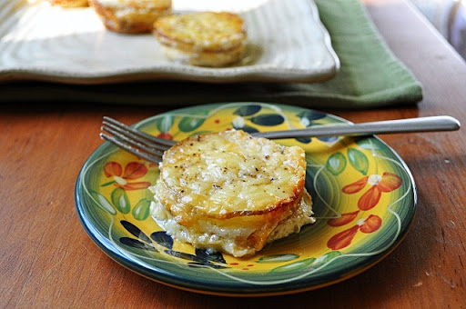 Spray 8 muffin tins with vegetable spray. Layer potato slices, cheese, and onions into each muffin cup. Season with salt and pepper and top each gratin with 1 or 2 tablespoons of heavy cream. Cover with foil and bake for 30 to 40 minutes, removing the foil halfway through cooking time. Invert gratins onto plate and serve.