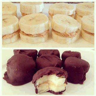- Cut up banana slices and then put then peanut butter between them. Put them in the freezer for 1 hour, then cover them in melted chocolate and put them back in the freezer for another 2-3 hours!