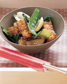 4. Stirring constantly, cook onions in skillet over high heat until browned, 5 minutes. Add mushrooms; cook 2 minutes. Add red pepper and bok choy stems; cook 3 minutes. Add peas and ginger; cook 1 minute. Add marinade, cornstarch mixture, bok choy greens, and tofu. Cook until heated through. Season with soy sauce as desired. Serve with limes.