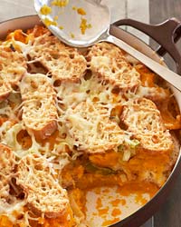 To assemble the gratin, preheat the oven to 400°. Bring the leek mixture to a boil. Spoon half of the squash into a 6- to 8-cup casserole. Ladle half of the leek mixture over the top and cover with half of the toast and half of the Gruyère. Repeat the layers with the remaining squash, leek mixture, toast and Gruyère. Sprinkle the Parmesan cheese over the top.