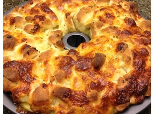 4.Layer dough pieces in bottom of bundt or fluted tube pan, next layer sliced pepperoni, shredded cheese and sprinkle with garlic powder. Repeat all three layers again in the same order, and then end with final layer of dough pieces.