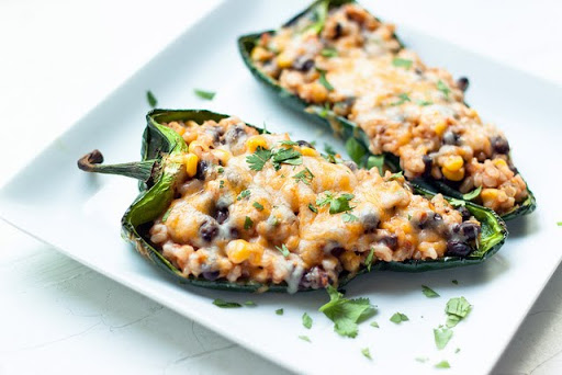 7 Place the pepper halves skin side down in a baking dish, and spoon the filing into each half. Top with shredded cheese and broil until the cheese is melted, for about 1 1/2 to 2 minutes.