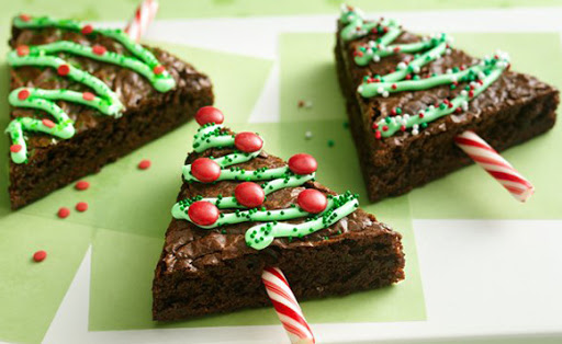 Cut into three rows--cut each row into triangles (save the smaller pieces crumbling over ice cream!) Break off the curved end of the candy canes and insert the straight end into the bottom of the brownie to form the tree trunk.
