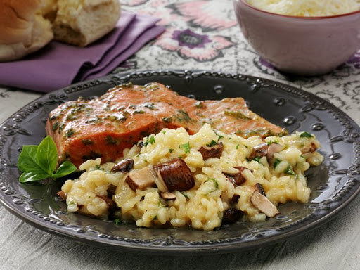 2. Add onion, mushrooms, rice and 1 tablespoon butter to oven bag. Turn bag several times to mix ingredients. Arrange ingredients in even layer in bag. Fold down bag opening two times to hold it open; set aside.