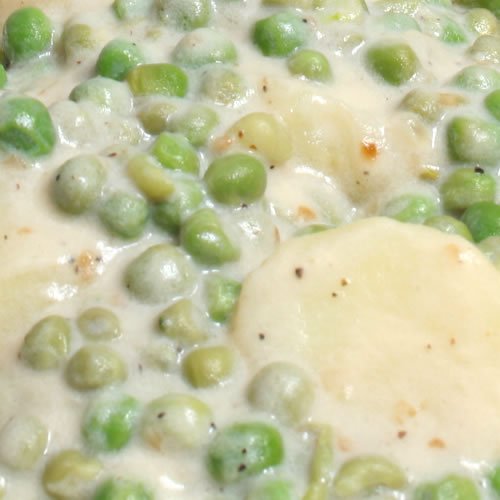 Preheat oven to 325 degrees F. Cut potatoes in half and place on greased baking pan. Sprinkle peas over potatoes. In saucepan, melt butter and stir in flour, salt and pepper. Add milk, stirring constantly until right consistency. Pour sauce over vegetables. Top with bacon and bake for 20 to 25 minutes.