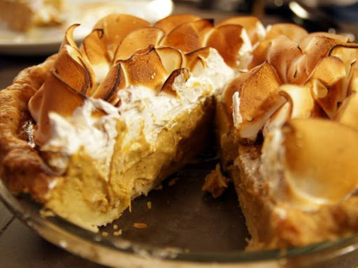 To ASSEMBLE: Attach a "saint honore" tip to a piping bag, or cut the tip of a plastic pastry bag at a 30-degree angle to create the same effect. Fill with the meringue and pipe the "leaf" peaks on top of the pie, and then torch until the meringue is toasty brown.