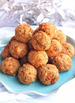 Heat 1″ of oil in a large frying pan until a deep fry thermometer registers at 350ºF. Fry the crab bites until golden brown. Drain on paper towels and place on a cookie sheet in a 200ºF oven to keep them warm while you fry the rest of them up.