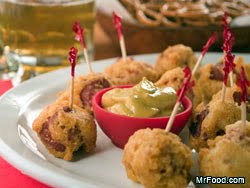 4.Dip each hot dog chunk in the batter, coating well. Carefully place in the oil and fry until golden, turning if necessary. Remove the dogs from the oil and drain on paper towels. Serve immediately.